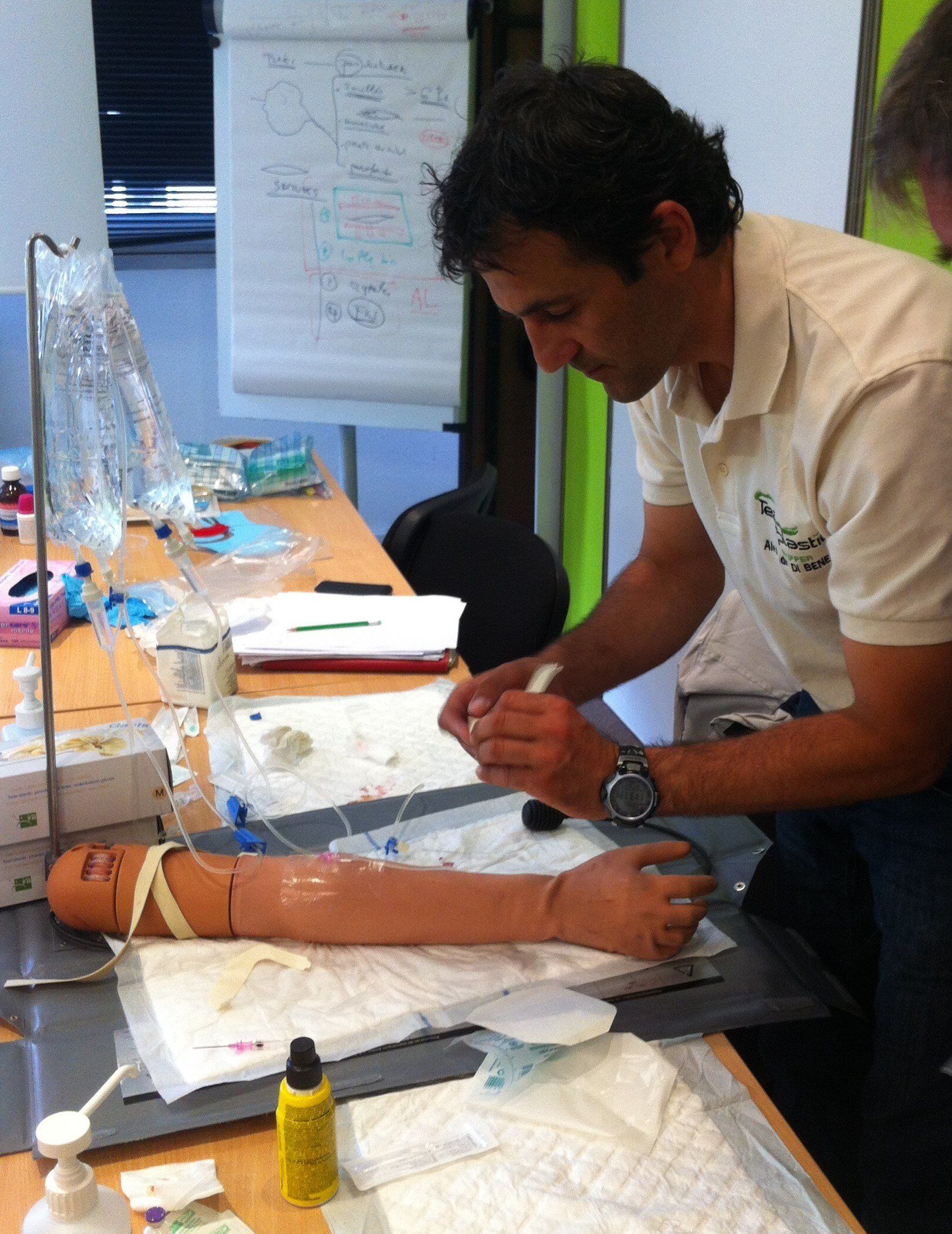 Les gestes techniques que l’équipage peut être amené à effectuer sont réalisés concrètement (sutures cutanées, injection intramusculaire…).